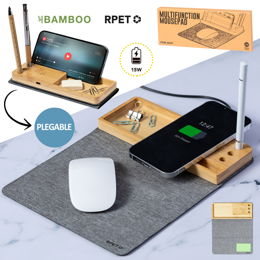 Vino y accesorios hosteleriaElegante y funcional afombrilla plegable fabricada en combinación de suave poliéster RPET y bambú. Con entrada tipo C -cable negro Tipo C incluido- y cargador inalámbrico de 15W,compatible con dispositivos equipados con tecnología de carga inalámbrica Qi. Incluye soporte para smartphone, soporte para bolígrafos, y compartimento libre de almacenaje en bambú. Base antideslizante que garantiza un uso cómodo y estable.Incluye manual de uso en en español e inglés. Presentada en caja individual de diseño kraft y en bolsa reciclada.El material RPET se elabora a partir de plástico reciclado, para así fomentar la reutilización de residuos plásticos y ayudar a la sostenibilidad del planeta.En cumplimiento con los requisitos de seguridad: Sistema de protección contra sobrecalentamiento. Sistema de protección contra sobrecarga. Sistema de bloqueo para evitar cortocircuitos. Plegable. Cargador Inalámbrico 15W. Antideslizante