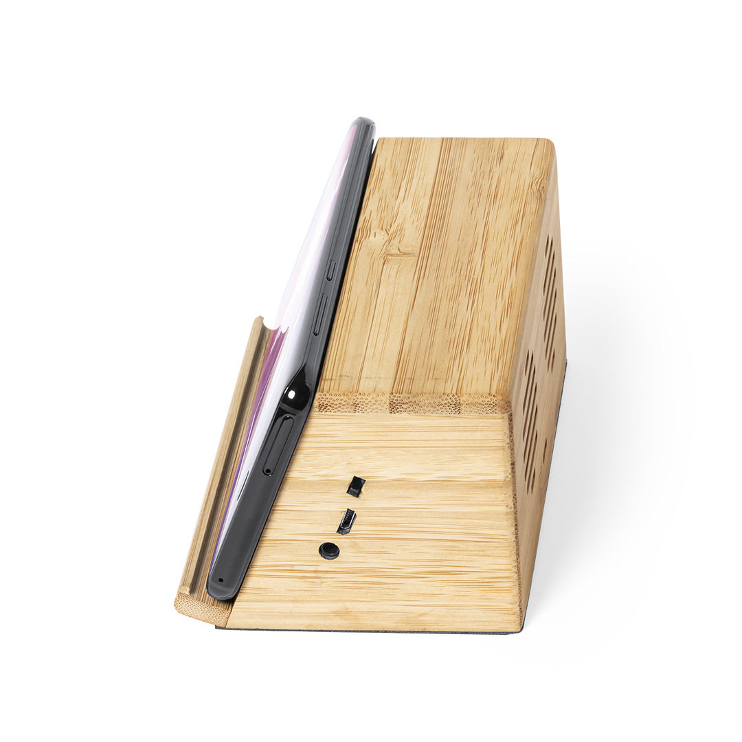 Altavoz cargador inalámbrico de inducción, de línea nature y carga 10W. Con soporte para smartphone integrado y 2 altavoces de 3W cada uno. Fabricado en bambú procedente de cortes naturales, con base antideslizante. Compatible con dispositivos equipados con tecnología de carga inalámbrica y recargable mediante cable USB -incluido-. Amplia superficie de marcaje y presentado en atractiva caja de diseño eco. Inalámbrico 10W. Conexión Inducción. Potencia Sonido 3Wx2. Batería 1.200 mAh