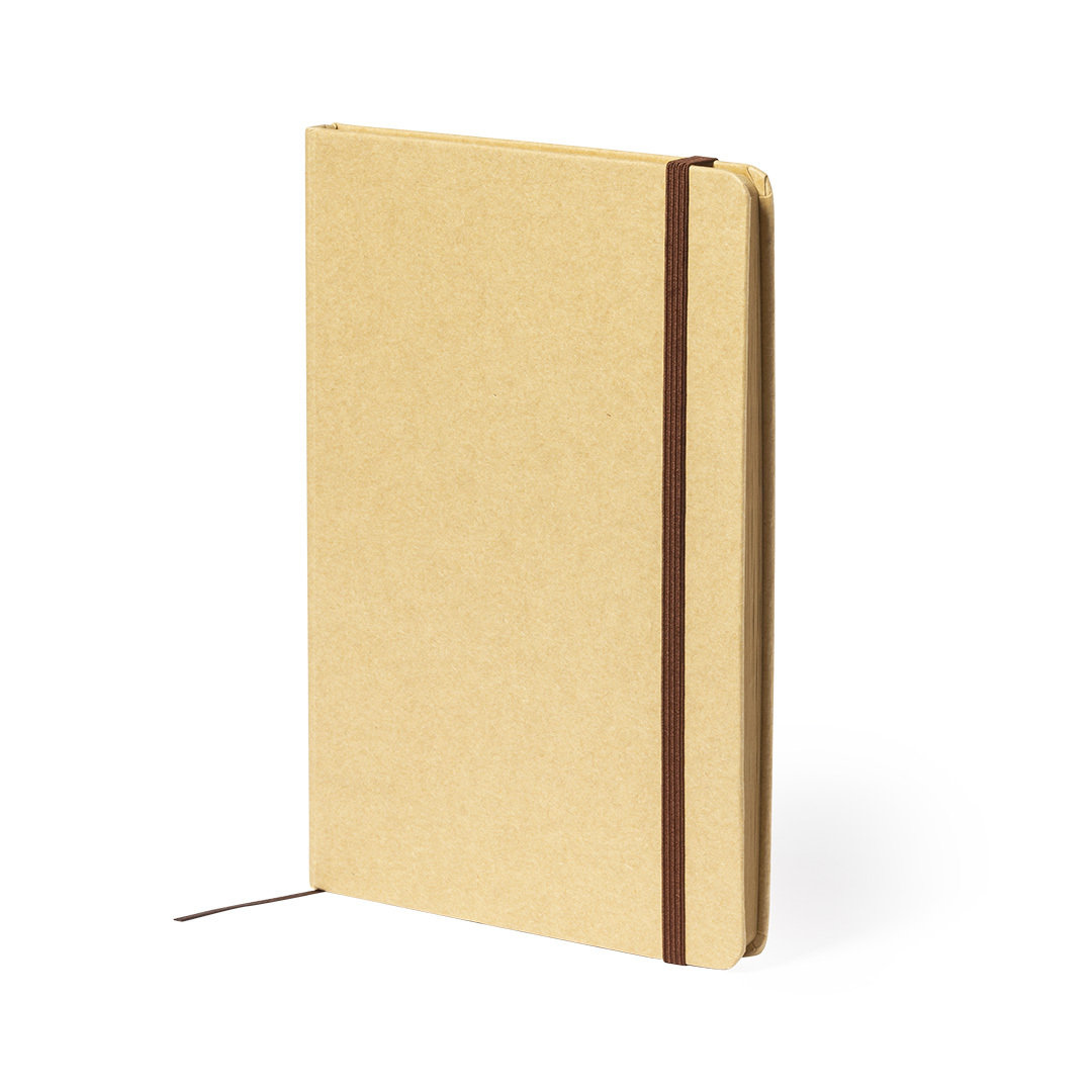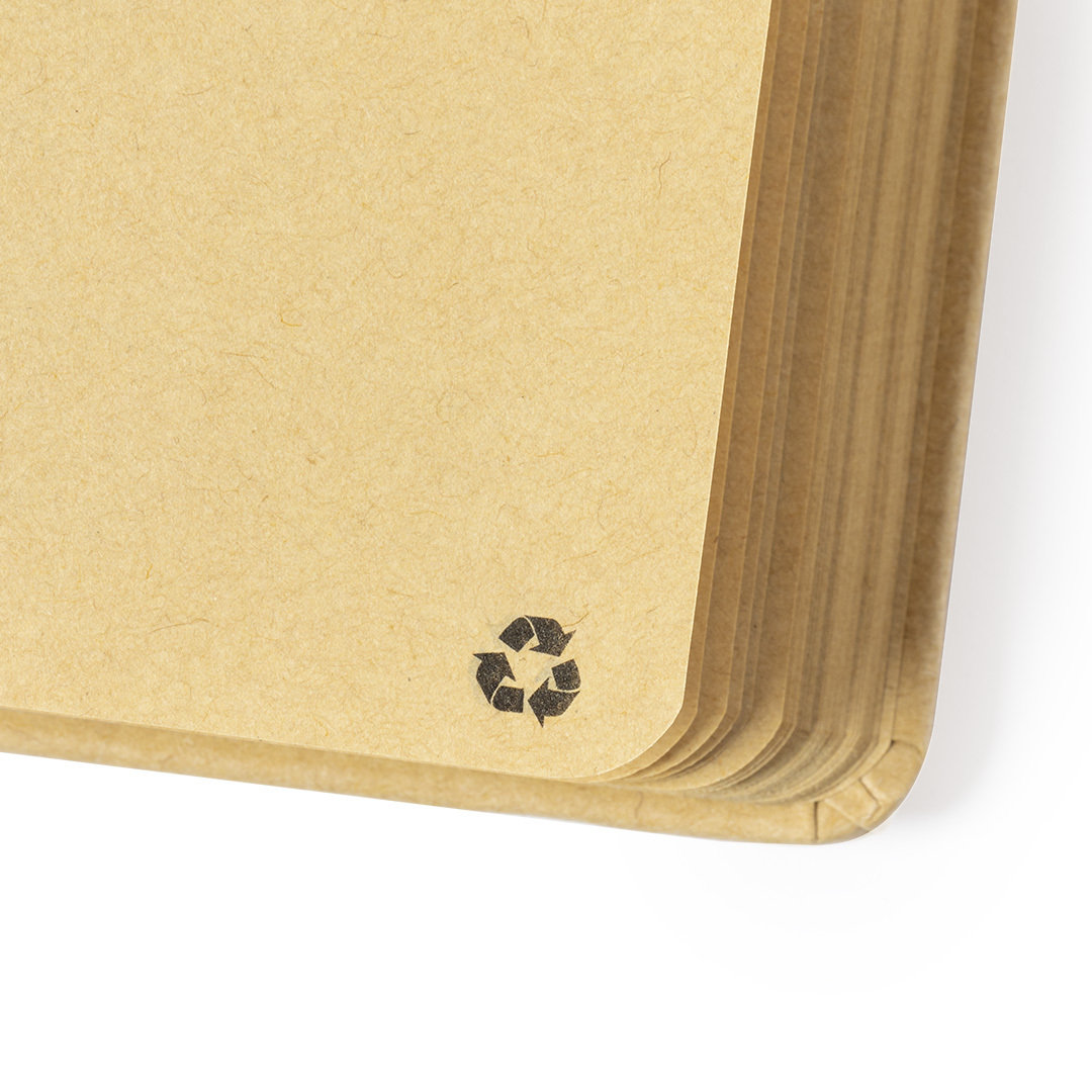 Vino y accesorios hosteleriaBloc de notas A5 de línea nature, con tapas duras en resistente cartón reciclado. De 100 hojas lisas en acabado kraft con distintivo reciclado, con elástico de sujeción y marcapáginas de tela a juego. Portada Rígida. 100 Hojas