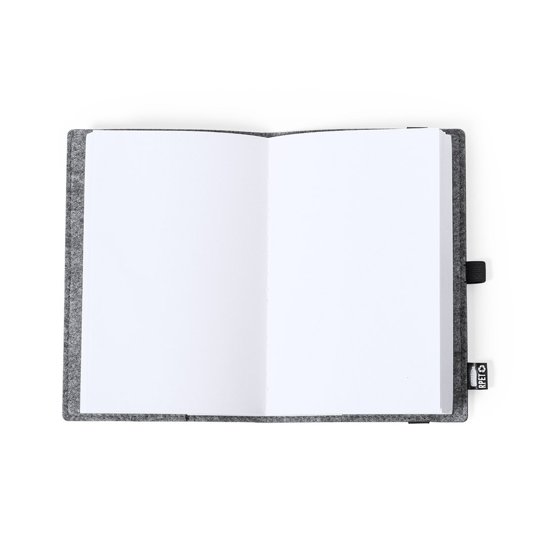 Bloc de notas A5 de línea nature con funda en fieltro RPETreciclado, fruto de la combinación del proceso de reciclaje de materiales plásticos junto con la técnica milenaria de fabricación del fieltro, dando como resultado un material de eco-tendencia que, además de ser de origen reciclado, también se convierte en reciclable.Incluye 100 hojas lisas. Con elástico de sujeción, soporte para bolígrafo y etiqueta RPET en portada. 100 Hojas