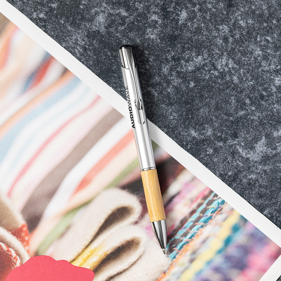 Vino y accesorios hosteleriaElegante bolígrafo de línea nature y mecanismo pulsador. Cuerpo en resistente ABS de acabado brillo y empuñadura en bambú, con accesorios a juego. Clip metálico, con cartucho jumbo y en tinta azul. Carga Jumbo