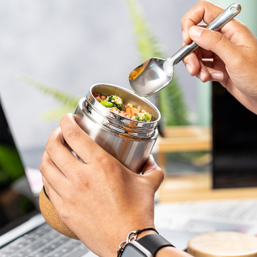 Vino y accesorios hosteleriaFiambrera de línea nature y 450 ml de capacidad. Cuerpo en acero inox, con base de corcho para mantener la temperatura y tapón de seguridad en bambú, con accesorio de fijación para la cuchara de acero inox (incluida). Presentada en caja individual de diseño eco en cartón kraft. 450 ml