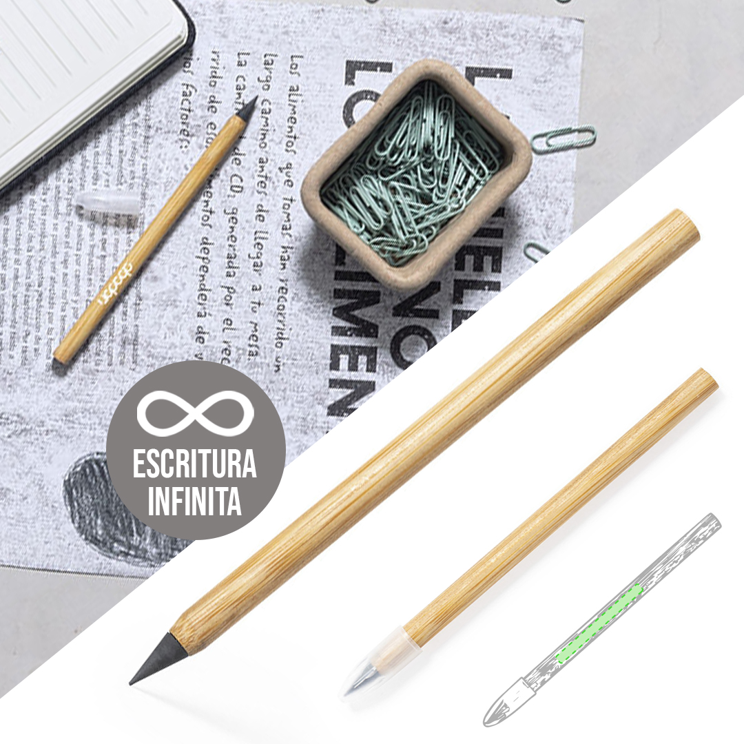 Vino y accesorios hosteleriaLápiz eterno de línea nature. Fabricado en bambú, fomentando la utilización de materias primas naturales y reducir las emisiones contaminantes. Reutilizable y con escritura infinita, para así usar siempre el mismo lápiz y no generar residuos.