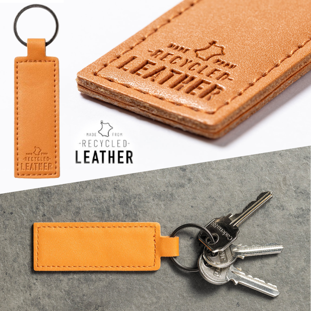Vino y accesorios hosteleriaLlavero de línea nature fabricado en cuero reciclado. En tono marrón, con diseño rectangular y de acabado cosido. Grabado con distintivo cuero reciclado en una cara, con lado opuesto liso para impresión. Anilla metálica cromada y presentado en bolsa individual kraft.El cuero reciclado rescata las fibras desechadas en los procesos de fabricación del cuero, minimizando el desperdicio de material, contribuyendo a reducir el impacto ambiental y manteniendo a la vez sus propiedades originales.