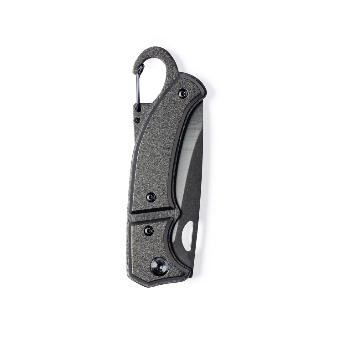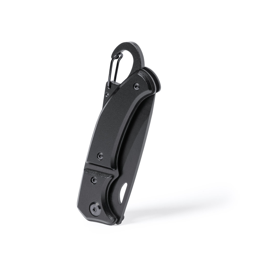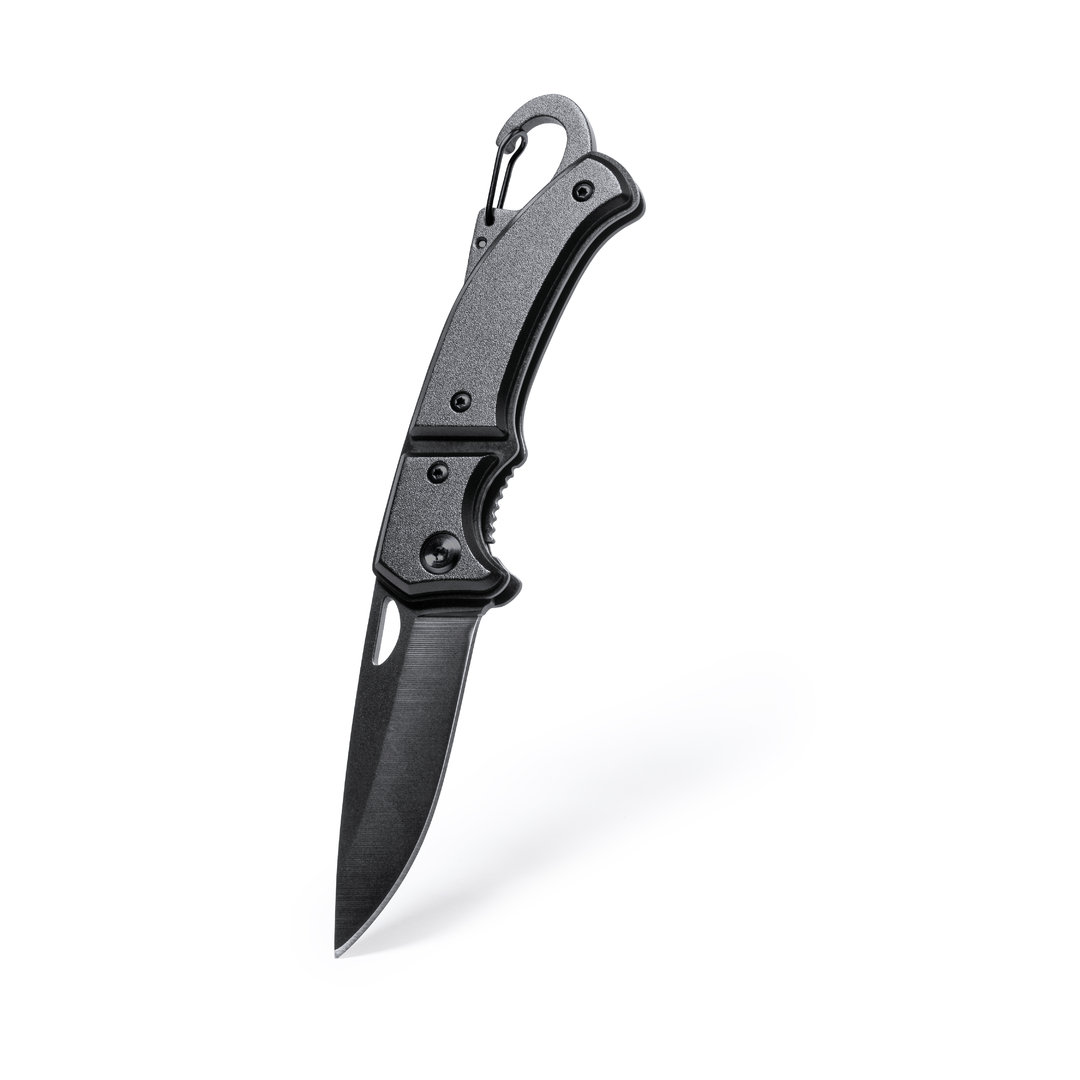 Vino y accesorios hosteleriaNavaja con hoja en acero inox de acabado negro y resistente empuñadura a juego en aluminio. Con mosquetón integrado en mango y bloqueo de seguridad. Con troquelado en hoja para una fácil apertura y presentada en caja individual de diseño negra. Con Bloqueo