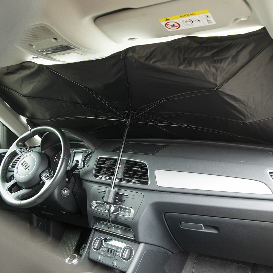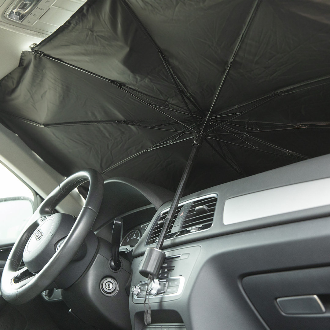 Parasol plegable para coche. Medida de 140x78cm. Con mecanismo de apertura manual y funda de políester incluida Funda Poliéster
