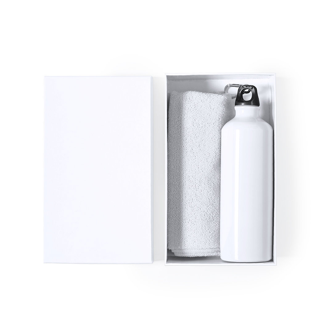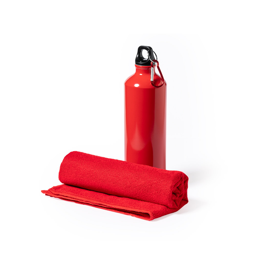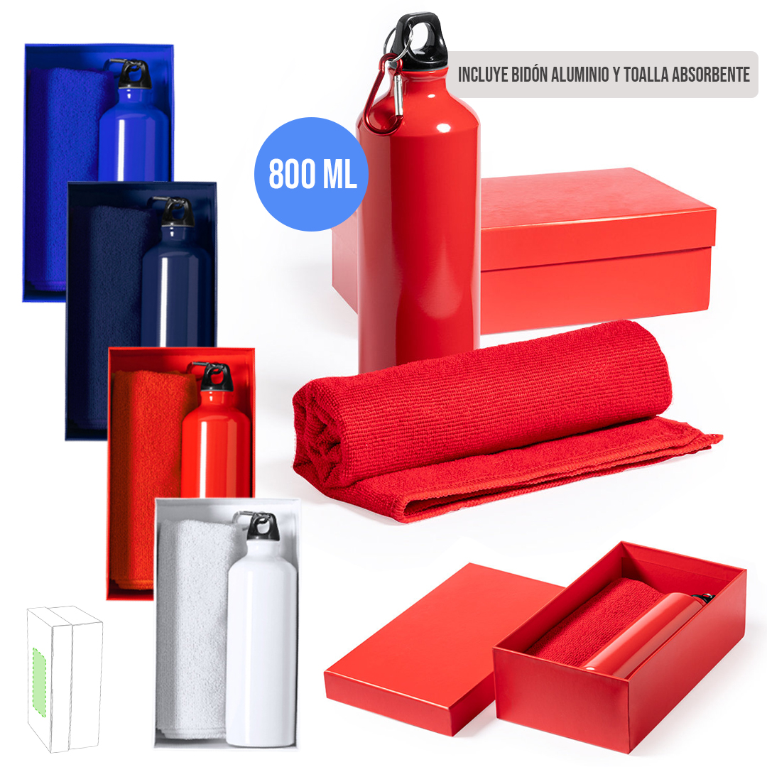 Set de bidón y toalla a juego. Incluye: Bidón de 800 ml de capacidad con cuerpo en aluminio de acabado brillo. Con tapón de seguridad a rosca y mosquetón metálico de transporte. Toalla absorbente fabricada en microfibra de 160g/m2 y tamaño 40×90 cm. Set disponible en variada gama de colores y presentado en caja de cartón con colores a juego. Bidón Aluminio 800 ml. Toalla Absorbente Microfibra 160 g/ m2