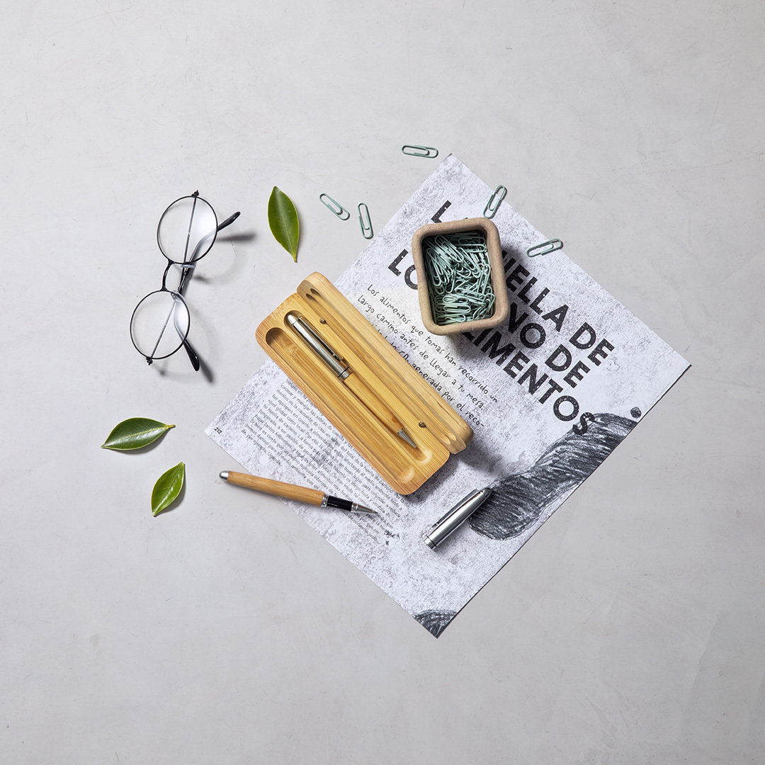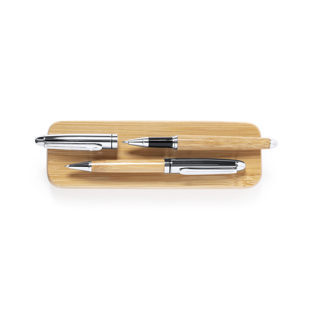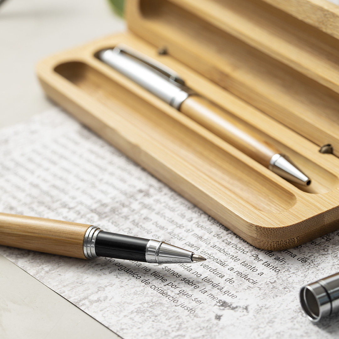 Vino y accesorios hosteleriaSet de bolígrafo y roller de línea nature. Fabricado en combinación de bambú con metal, para así fomentar la utilización de materias primas naturales y reducir las emisiones contaminantes. Bolígrafo de mecanismo giratorio en tinta azul. Roller con capucha, tinta gel en azul y carga jumbo. Presentado en estuche individual de bambú. Bolígrafo y Roller. Carga Jumbo
