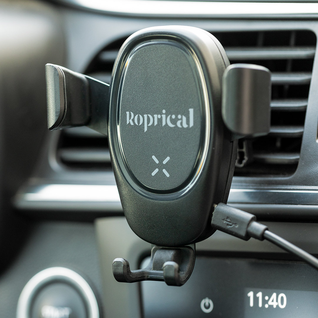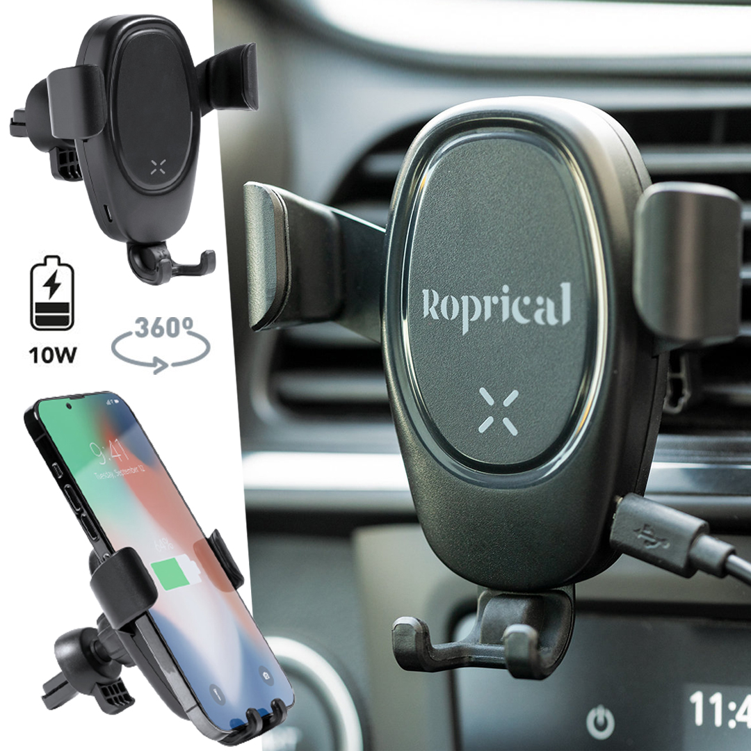 Vino y accesorios hosteleriaSoporte de rejilla de coche para smartphone con cargador inalámbrico 10W integrado. Mecanismo de ajuste automático universal para poder usar el dispositivo mientras se está cargando. Compatible con dispositivos equipados con tecnología de carga inalámbrica. Presentado en atractiva caja individual de diseño. Inalámbrico 10W. Ajustable