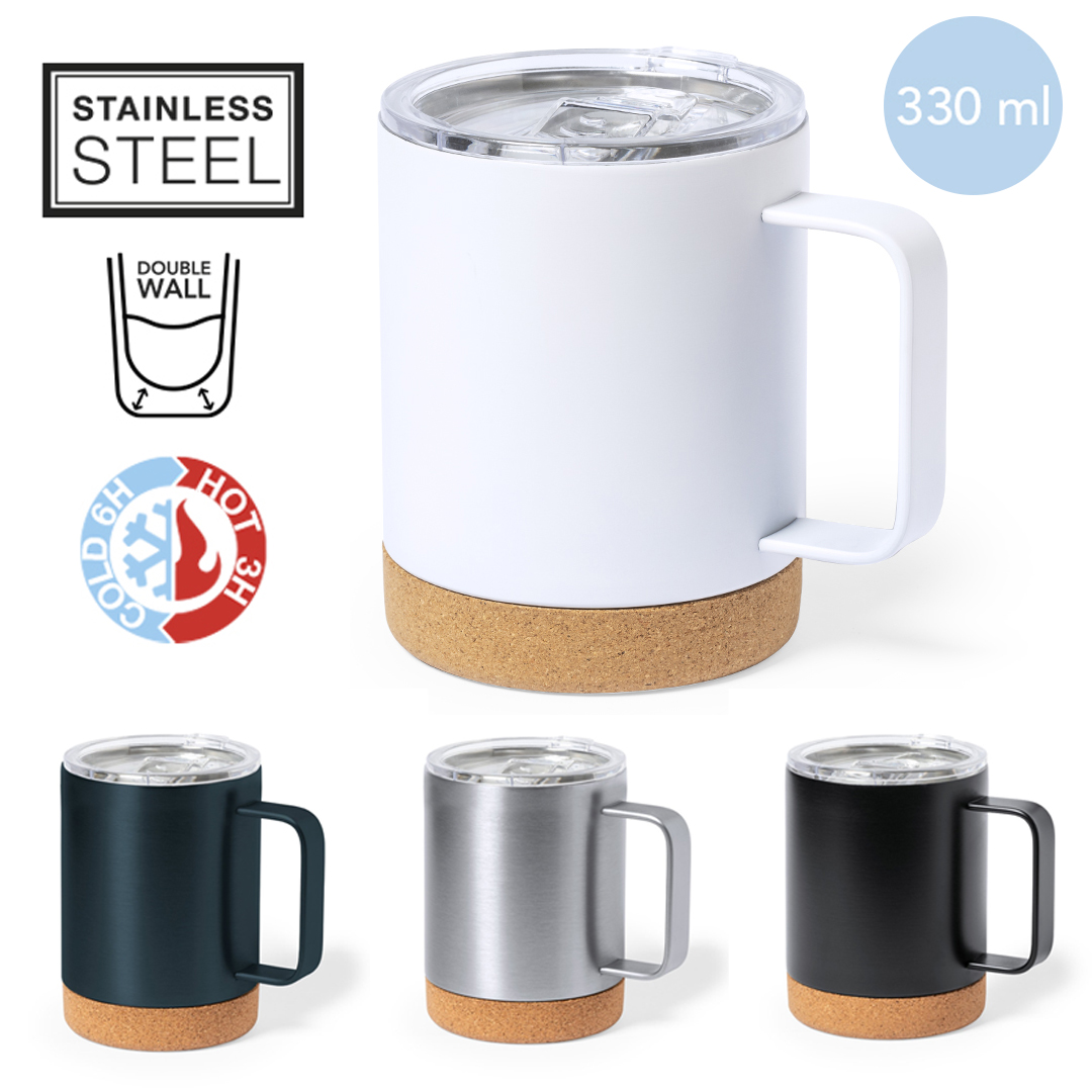 Vino y accesorios hosteleriaTaza térmica fabricada en acero inox de doble pared y 330ml de capacidad de color mate. Con dosificador en tapa, libre de BPA, y base en corcho natural. Es ideal para tener en tu escritorio, mesa o en cualquier superficie donde disfrutar tranquilamente de tu bebida favorita. 330 ml
